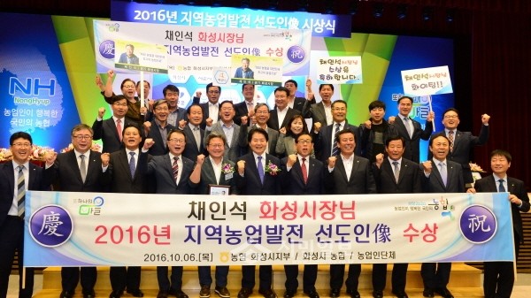 지난 6일 채인석 경기 화성시장은 농협중앙본부 본관 대강당에서 지역농업 발전에 기여한 공로를 인정받아 '2016년 지역농업발전 선도인상'을 수상했다. 사진은 채 시장(앞줄 왼쪽에서 다섯번째)과 관계자들이 기념촬영하는 모습.(사진제공=화성시청)