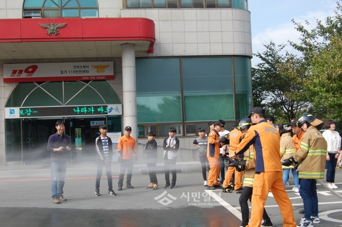 지난 6일 경기 안성소방서는 한겨레중학교 학생 19명을 대상으로 소방관 직업체험교육을 실시했다. 사진은 학생들이 소방호스를 이용해 방수 체험을 하는 모습.(사진제공=안성소방서)