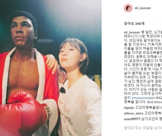 그런가하면 알리는 자신의 SNS에 가수 스테파니가 보내준 사진을 공개하며 “몇 일전, 싱가폴로 촬영 간 스테파니가 나랑 찍었다며 보내준 사진이다. 생김새도 닮아보이는 것 같아 진짜 이름 잘 지었구나, 키득거렸다. 그와 같은 이름을 얻어 처음엔 여자답지 않다며 이름을 지어준 리쌍오빠들한테 엄청 투덜댔었다. 권투도 안해본 나한테 #알리 라니. 공장에서 앨범이 다 찍어나온 상태였어도 예명이 마음에 안들어 계속 찾아봤다”라고 당시의 감정을 솔직하게 고백했다.