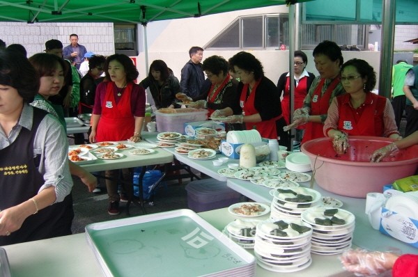 지난 7일 경기 동두천시 중앙동 새마을남녀지도자협의회에서는 동주민센터 주차장에서 지역내 노인들에게 국수를 대접하는 ‘사랑의 국수 잔치’를 열었다. 사진은 협의회 관계자들이 음식을 만드는 모습.(사진제공=동두천시청)