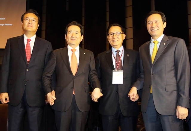 정세균 국회의장(왼쪽 두번째)과 새누리당 정진석(맨 왼쪽), 더불어민주당 우상호(맨 오른쪽), 국민의당 박지원 원내대표가 10일 오전 서울 소공동 웨스틴조선호텔에서 열린 J글로벌·채텀하우스·여시재 포럼에 참석, 취재진의 카메라 앞에서 손을 잡고 있다.
