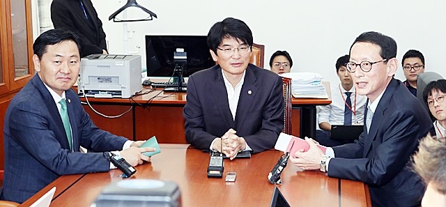 새누리당 김도읍(오른쪽부터), 더불어민주당 박완주, 국민의당 김관영 원내수석부대표가 11일 오후 국회에서 만나 운영위원회 증인과 관련한 논의를 하고 있다.