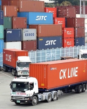 화물연대 운송거부 이틀째인 11일 부산항에 투입된 군 수송차량이 부산 남구 신선대 부두에서 환적화물을 수송하고 있다. 국방부에서 지원한 컨테이너 차량 42대가 7개 운송사에 배차돼 환적화물을 수송하고 있다.