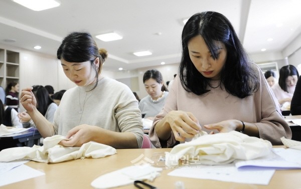 지난 10일 서울 광진구는 보건소 보건교육실에서 '제11회 임산부의 날'을 맞아 '행복한 임신, 아름다운 D라인' 행사를 개최했다. 사진은 임신부들이 배냇저고리를 만드는 모습.(사진제공=광진구청)