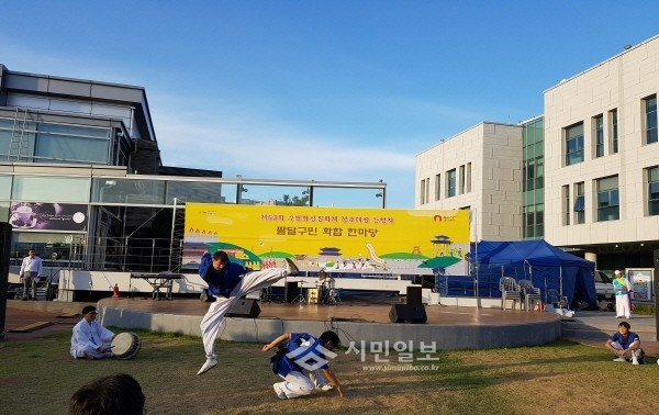 지난 9일 경기 수원시 팔달구 고등동은 구청 앞뜰에서 열린 '팔달구민 화합 한마당'에서 주민자치센터 프로그램 중 하나인 ‘양생택견’ 공연을 선보였다. 사진은 참여자들이 힘차게 택견을 하는 모습. (사진제공=팔달구청)