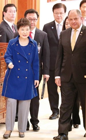 박근혜 대통령과 루이스 기예르모 솔리스 코스타리카 대통령이 12일 청와대에서 열린 한·코스타리카 정상회담을 위해 회담장으로 들어서고 있다.