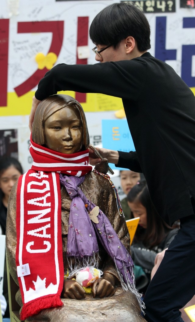 12일 서울 종로구 옛 일본대사관 앞에서 열린 일본군 위안부 문제 해결을 위한 수요집회에서 한 참가자가 소녀상에 목도리를 두르고 있다.