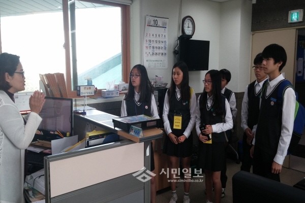 지난 11일 경기 김포시 구래동은 장기중학교 학생 6명을 대상으로 자유학기제 청소년 진로체험 프로그램을 진행했다. 사진은 학생들이 주민센터 관계자에게 공무원 역할 등에 대한 설명을 듣는 모습.(사진제공=김포시청)