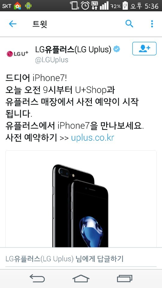 LG유플러스는 13일 오후 5시 공식 트위터를 통해 "오늘 오전 9시부터 U+SHOP과 유플러스 매장에서 아이폰7 사전예약이 진행된다"고 밝혔다.
