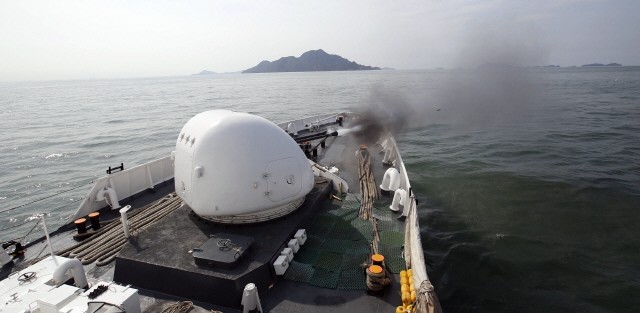 불법조업 중국어선의 공격을 받고 해경 고속단정이 침몰한 사건을 계기로 정부가 강력한 대응을 예고한 가운데 13일 오후 인천시 옹진군 선갑도 인근 해상에서 해경이 사격 훈련을 하고 있다. 인천해양경비안전서는 이날 오후 1시부터 2시 30분까지 옹진군 선갑도 인근 3.2㎞ 해상에서 함포와 벌컨포를 동원해 사격훈련을 했다.