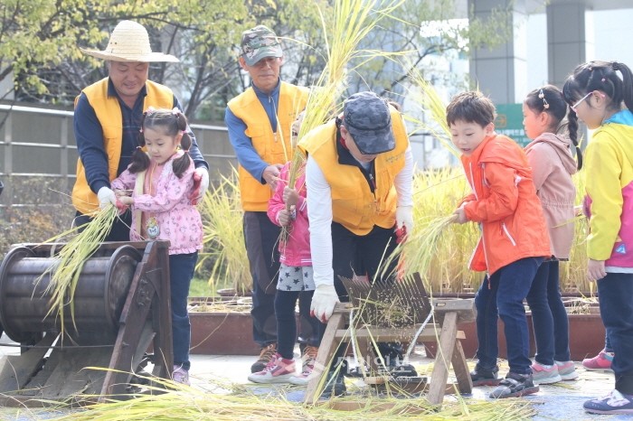 서울 금천구는 지난 13일 구청 2층 보건소 앞 광장에서 지역내 어린이집 아이들이 참여하는 가을걷이 행사를 개최했다. 사진은 어린이들이 전통방식인 홀태와 탈곡기를 이용해 탈곡 체험을 하는 모습.(사진제공=금천구청)