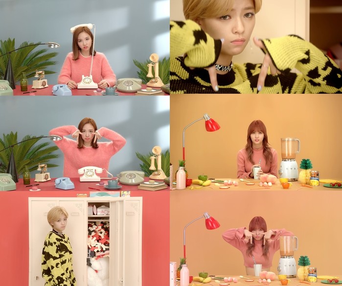 이날 공개된 영상 속 나연은 전화기 앞에서 누군가의 연락을 기다리는 깜찍함을, 정연은 몰래 선물을 주기 위해 노력하는 발랄함을, 모모는 누군가를 위한 과일 주스를 만들고 있는 귀여운 매력을 발산했다.