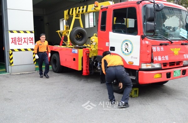 최근 서울 영등포소방서는 서울소방재난본부 주관으로 월동기 대비 출동태세 확립을 위한 장비검열을 실시했다. 사진은 소방서 관계자들이 소방차 검열을 하고 있는 모습.(사진제공=영등포소방서)