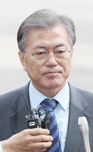 더불어민주당 문재인 전 대표가 17일 오전 인천시 남동구 이익공유 시행기업 ‘디와이’를 방문, 건물에 들어서기 전 취재진의 질문을 받고 있다.