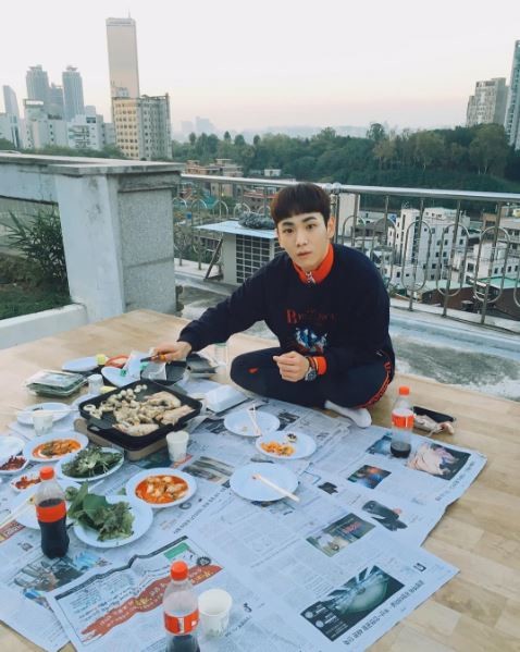 공개된 사진 속 키는 특유의 일자앞머리를 한 채로 옥상에 신문지를 깔고 앉아 삼겹살을 굽고 있다. 카메라를 보고 놀란듯한 표정을 짓는 그의 모습이 귀여운 매력을 더했다.