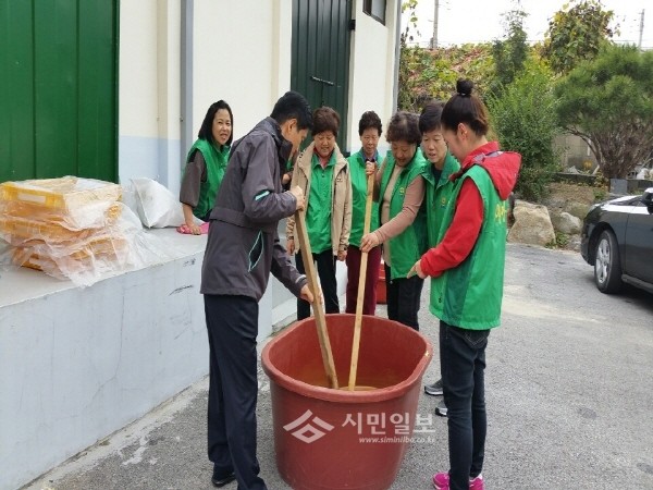 지난 17일 경기 포천시 이동면 새마을부녀회는 면사무소 옆마당에서 부녀회원 20명이 참여한 가운데 폐식용유를 이용한 '환경 친화적인 재생비누'를 제작했다. 사진은 회원들이 비누를 만들고 있는 모습.(사진제공=포천시청)