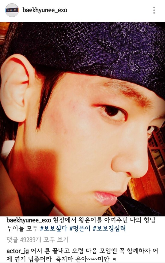 백현은 최근 자신의 인스타그램을 통해 “현장에서 왕은이를 아껴주던 나의 형님누이들 모두 #보보싶다 #멍은이 #보보경심려”라는 글과 함께 드라마 속 맡은 왕은 역의 복장을 하고 찍은 사진을 게재했다.