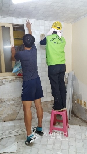 최근 서울 은평구 응암3동은 사랑나눔회봉사단과 함께 지역내 빈곤위기 가구를 대상으로 '행복한 방 만들기를 위한 집수리 봉사활동'을 실시했다. 사진은 봉사단원들이 벽지를 교체하고 있는 모습.(사진제공=은평구청)