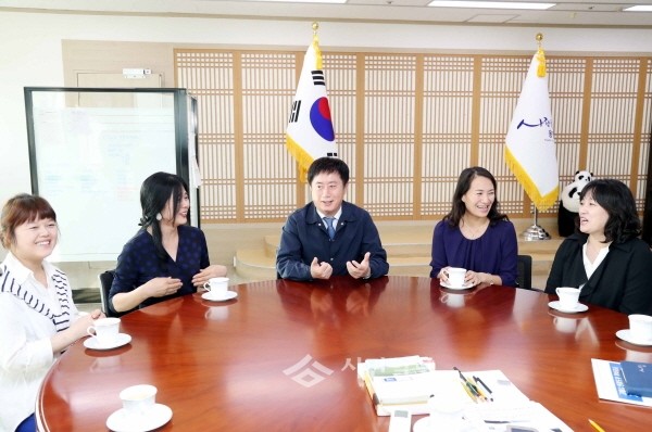최근 경기 용인시가 '공세초등학교 앞 지하차도 설치'를 결정한 것과 관련해 공세초 학부모들이 시청을 방문해 정찬민 시장에게 '감사패'를 전달했다. 사진은 정 시장(가운데)이 학부모들과 이야기를 나누는 모습.(사진제공=용인시청)