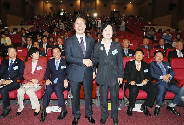 더불어민주당 추미애 대표가 19일 오후 국회 의원회관에서 열린 중앙위원회에서 민주당 김민석 대표와 악수하며 포즈를 취하고 있다. 더불어민주당은 이날 중앙위원회에서 민주당과의 통합 안건을 의결, 양당의 통합 절차를 공식적으로 마무리했다.