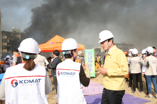 지난 19일 서울 강동구 상일동 고덕 3단지 재건축단지 일대에서 21만㎡ 대지의 철거예정 아파트 68개동을 실제 지진 피해 현장처럼 조성, 6.8규모의 지진으로 인한 복합재난에 대응한 실전훈련으로 실시된 ‘서울시 지진방재 종합훈련’ 에 참가한 이해식 구청장(오른쪽)이 재난의료지원팀과 현장 상황을 파악하고 있다.(사진제공=강동구청)