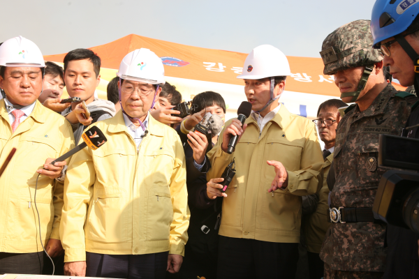 지난 19일 서울 강동구 상일동 고덕 3단지 재건축단지 일대에서 21만㎡ 대지의 철거예정 아파트 68개동을 실제 지진 피해 현장처럼 조성, 6.8규모의 지진으로 인한 복합재난에 대응한 실전훈련으로 실시된 ‘서울시 지진방재 종합훈련’에서 이해식 구청장(가운데)가 훈련에 참가한 현장 상황에 대해 설명하고 있다.(사진제공=강동구청)