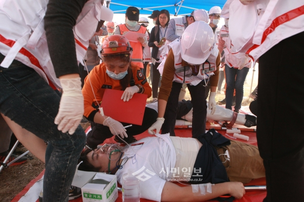 지진방재 종합훈련서 생존자 구조활동 펼치는 구급대원들