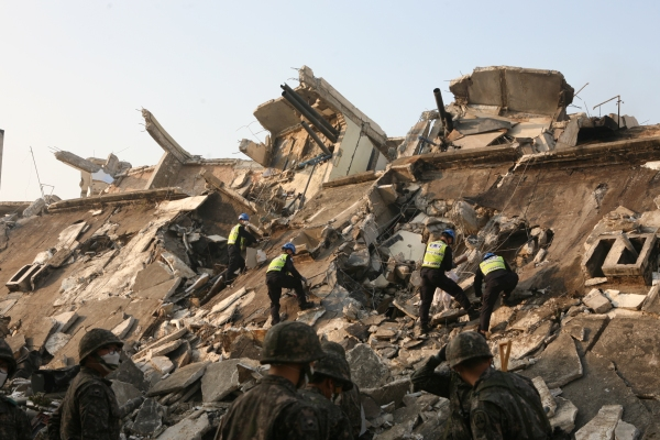 지난 19일 서울 강동구 상일동 고덕 3단지 재건축단지 일대에서 21만㎡ 대지의 철거예정 아파트 68개동을 실제 지진 피해 현장처럼 조성, 6.8규모의 지진으로 인한 복합재난에 대응한 실전훈련으로 실시된 ‘서울시 지진방재 종합훈련’ 현장에서 훈련에 참가한 경찰들이 생존자를 탐색하고 있다.(사진제공=강동구청)