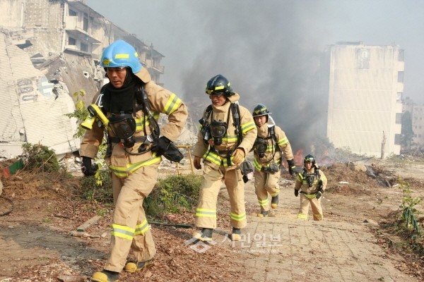지난 19일 서울 강동구 상일동 고덕 3단지 재건축단지 일대에서 21만㎡ 대지의 철거예정 아파트 68개동을 실제 지진 피해 현장처럼 조성, 6.8규모의 지진으로 인한 복합재난에 대응한 실전훈련으로 실시된 ‘서울시 지진방재 종합훈련’에서 119 구급대원들이 재난지역 주변을 걸으며 생존자 탐색을 실시하고 있다.(사진제공=강동구청)