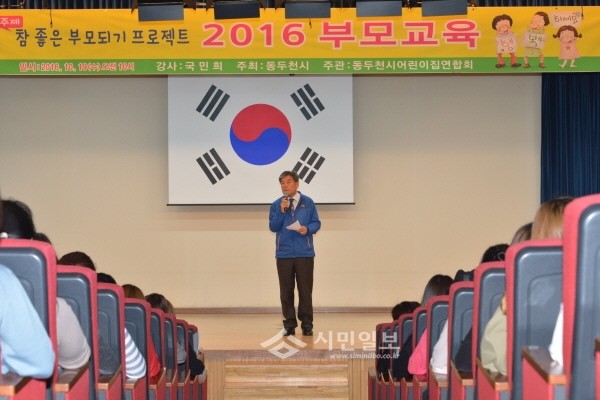 지난 19일 경기 동두천시 어린이집연합회는 아름다운문화센터 대강당에서 미취학 연령을 양육하는 부모를 대상으로 '2016년 참 좋은 부모 되기' 교육을 실시했다. 사진은 오세창 시장이 인사말을 하는 모습.(사진제공=동두천시청)
