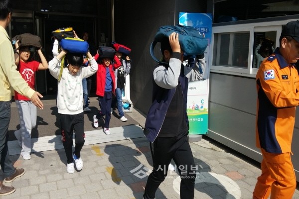 세종시는 지난 19일 '제403차 민방위 날'을 맞아 한솔초등학교에서 전교생을 대상으로 수업 중 지진 발생시 대피요령 등을 실습하는 '지진대비 시범훈련'을 실시했다. 사진은 학생들이 학교 건물 밖으로 대피하고 있는 모습.(사진제공=세종시청)