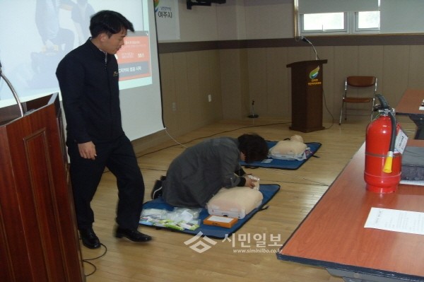 20일 경기 여주소방서는 금사면 복지회관에서 농어촌민박사업자 50여명을 대상으로 '소·소·심(소화기, 소화전, 심폐소생술) 및 응급처치교육'을 실시했다. 사진은 참여자가 심폐소생술 실습을 하는 모습.(사진제공=여주소방서)