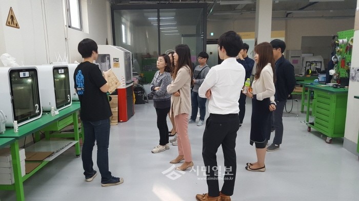 최근 서울 은평구는 서울혁신파크 제작동 1층(이노베이션팹랩)에서 구청 직원 30여명을 대상으로 3D프린터, 레이저 커팅기 등 디지털 장비의 사용법과 디지털 프로그램의 기초를 배우는 혁신교육을 실시했다. 사진은 교육 대상자들이 3D프린터 설명을 듣는 모습.(사진제공=은평구청)