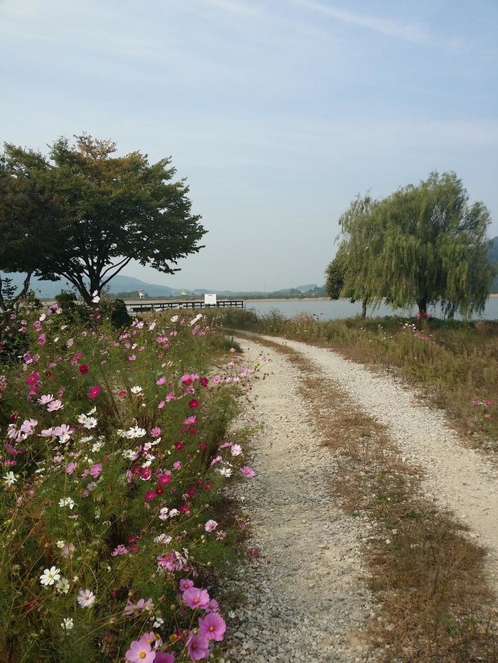 내용을 보면 화사한 코스모스가 핀 길과 수려한 풍경이 담겨있다.