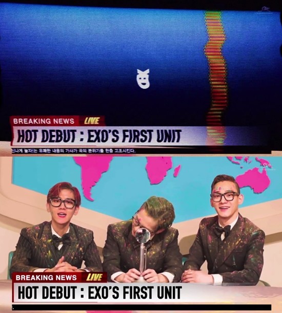 SM엔터테인먼트는 22일 자정 공식 유튜브 채널을 통해 ‘HOT DEBUT : EXO'S FIRST UNIT’ 영상을 공개했다. 영상 속 첸, 백현, 시우민은 뉴스 앵커 콘셉트로 등장해 유닛의 새로운 소식에 대해 전했다.