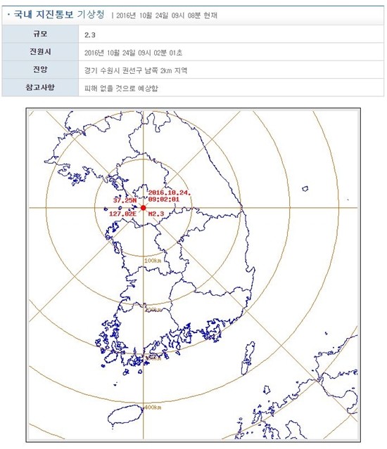 기상청은 수원 권선구에서 24일 오전 9시 경 규모 2.3의 지진이 발생했다고 알렸다.