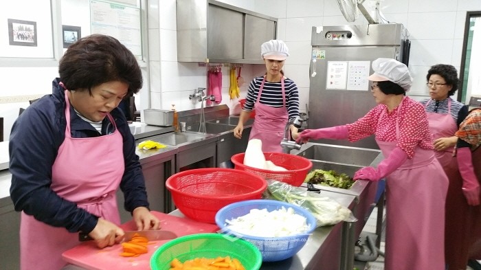 최근 인천 남동구의회는 성산종합사회복지관을 방문해 복지관을 이용하는 노인 60여명을 대상으로 무료급식 자원봉사활동을 실시했다. 사진은 임순애 의장(왼쪽)과 의원들이 관계자들과 함께 음식재료 손질을 하는 모습.(사진제공=남동구의회)
