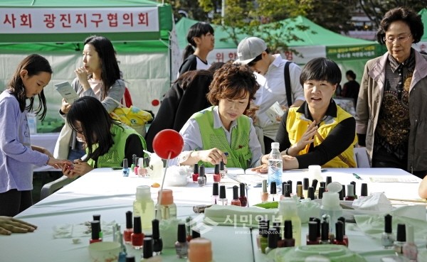 지난 22일 서울 광진구는 능동로 건대 분수광장에서 38개 봉사단체와 자원봉사자 등 500여명이 참여한 가운데 ‘2016 광진구 자원봉사 박람회’를 열었다. 사진은 이날 박람회 체험부스에서 참여자들이 네일아트를 진행하는 모습.(사진제공=광진구청)