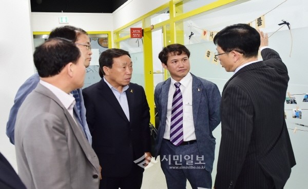 최근 경기 안산시 월피동 광덕시장 3층에 새롭게 조성된 시 사회적경제지원센터 교육장에서 열린 개소식에 참여한 제종길 시장(가운데)이 관계자들과 함께 센터를 둘러보며 이야기를 나누고 있다.(사진제공=안산시청)