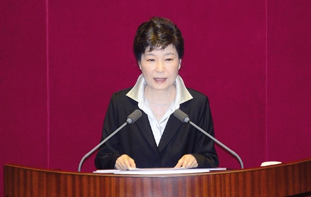 박근혜 대통령이 24일 오전 국회 본회의장에서 예산안 시정연설을 하고 있다. 박 대통령 연설 도중 “개헌 논의 더는 미룰 수 없다는 결론”을 내렸다며 “시기적으로 지금이 개헌 논의 적기로 판단”한다고 말했다.