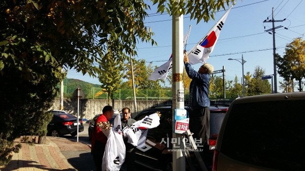 경기 동두천시 소요동 주민자치위원회 지역개발환경 분과에서는 지난 24일 소요동 주민센터에서 산업단지내 훼손된 태극기를 교체했다. 사진은 참여자들이 열심히 태극기를 교체하는 모습.(사진제공=동두천시청)