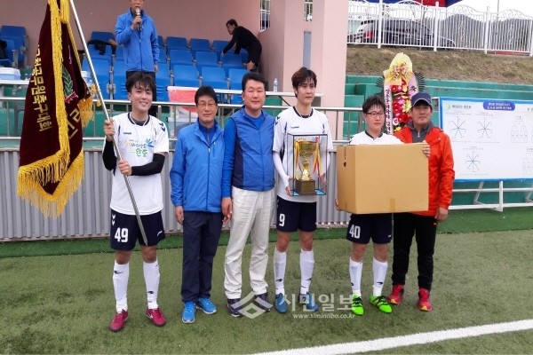 최근 전남 완도군공무원축구팀이 장흥군 심천축구장과 장흥댐 축구장에서 열린 '제17회 전라남도지사기 공무원축구대회'에서 우승을 차지했다. 사진은 선수들이 우승컵과 우승기를 들고 기념촬영하는 모습.(사진제공=완도군청)