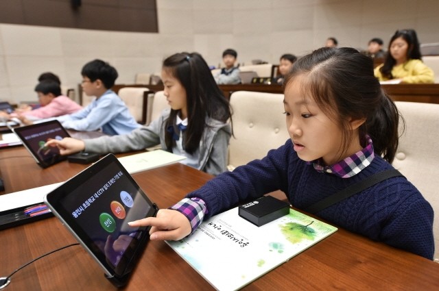 | ▲어린이 의회체험교실에 참여한 정평초등학교 학생들이 모의의회 체험에서 전자투표를 진행하고 있다. | ||