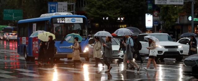 비가내린 25일 서울 명동에서 출근길 시민들이 횡단보도를 건너고 있다.