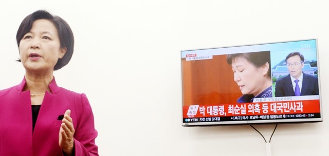 더불어민주당 추미애 대표와 지도부가 25일 오후 국회 당대표 회의실에서 박근혜 대통령의 최순실 의혹 관련한 사과방송을 지켜본 뒤 발언하고 있다.