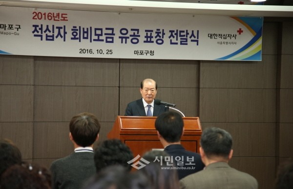 지난 25일 서울 마포구는 중회의실에서 '적십자회비모금 유공자 표창 전달식'을 개최하고 공무원 8명과 모금위원(통장) 19명에게 표창장을 전달했다. 사진은 박홍섭 구청장이 축사하는 모습.(사진제공=마포구청)