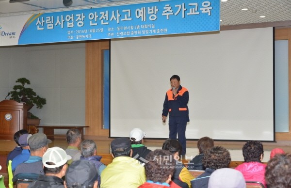 지난 25일 경기 동두천시는 시청 대회의실에서 공원녹지과 소속 기간제근로자 100여명을 대상으로 '산림산업장 안전사고 예방교육'을 실시했다. 사진은 산림조합 중앙회 임업기계 훈련원 조항만 강사가 근로자들에게 강의하는 모습.(사진제공=동두천시청)