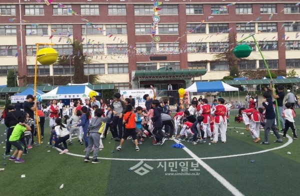 최근 경기 안산시 사2동 체육회가 ‘제31회 안산시민의 날’을 기념해 ‘향기나는 우리 사2 깔깔운동회’개최했다. 사진은 체육대회 참가자들이 즐겁게 박터뜨리기를 하고 있는 모습.(사진제공=안산시청)
