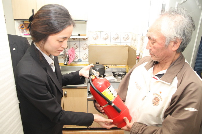 지난 25일 관악소방서는 지역내 소방차 통행 불가지역에 주택용 소방시설을 보급했다. 사진은 이날 소방서 관계자가 노인에게 소화기를 전달하는 모습.(사진제공=관악소방서)