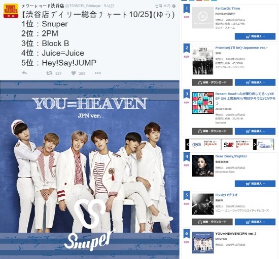 스누퍼의 소속사 위드메이 측은 "스누퍼가 일본 타워레코드 시부야점 데일리 차트 1위와 오리콘 차트 6위에 올랐다"고 27일 밝혔다.
